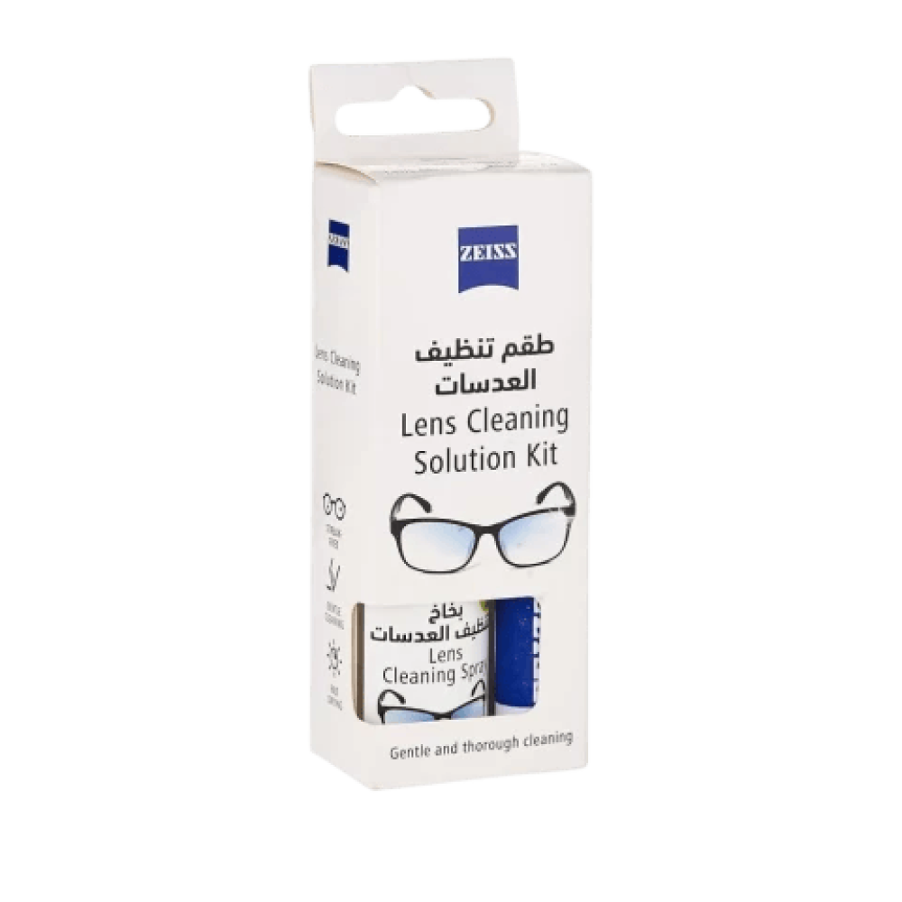(محلول تنظيف العدسات من ZEISS + مساحة مايكروفايبر المخصصة) = عدساتك نظيفة تماماً دون آثار لمادة التنظيف عليها.